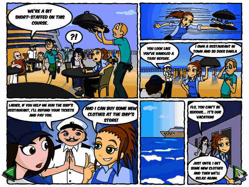 Flo和好朋友Darla暂时关闭了餐厅,准备去度假旅行。先是在船上游轮餐厅遇到了员工罢工,FLO不慎将行李掉到了水中,船长得知FLO和Darla有过经营餐厅的经历,以免费的船票作为利益邀请她们来帮忙打理餐厅,为了更多的新衣服和免费的船票,FLO又要开始忙碌了!