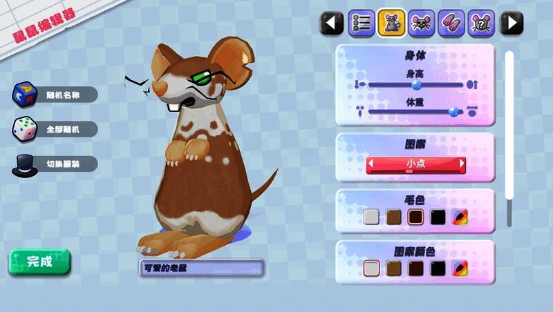 游戏最大的亮点之一是其丰富的自定义系统。玩家不仅可以通过更换壁纸、地毯等元素自由搭配35种不同主题的家居风格(如外太空、田园风等),还能通过“啮齿动物编辑器”对主角小鼠进行外观定制,包括毛色、尾巴长度、耳型以及服饰配件,打造真正独一无二的萌宠伙伴。