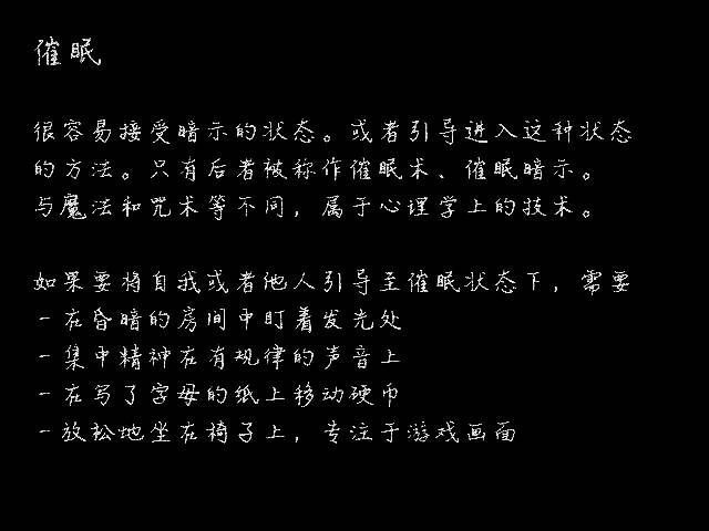 游戏中玩家需要扮演被催眠的少女,找出脱离催眠状态的方法。