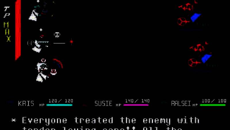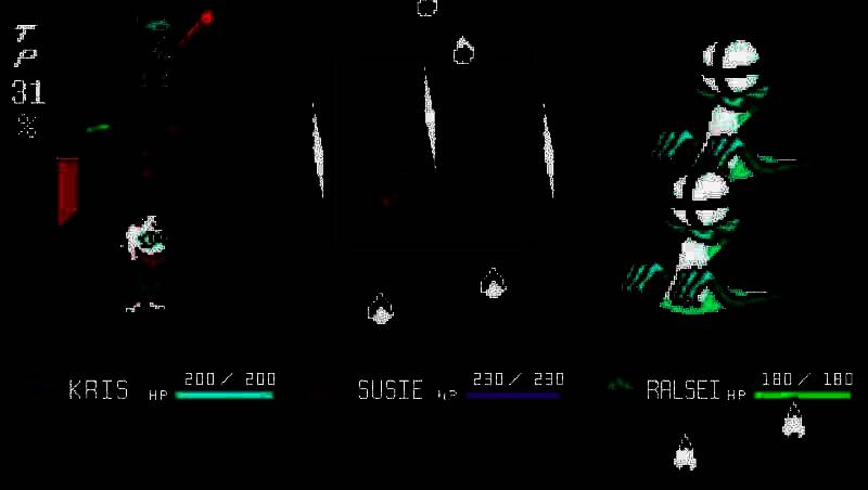 战斗中,Kris、Susie与Ralsei各有分工:Kris攻守均衡,Susie擅长输出,Ralsei则主修治疗与辅助。合理调配如Ralsei的群体治疗或Susie的破防技能“S-Action”,以及利用TP释放法术(如“冰爆”控场、“冻结技”限制敌人),成为取胜关键。