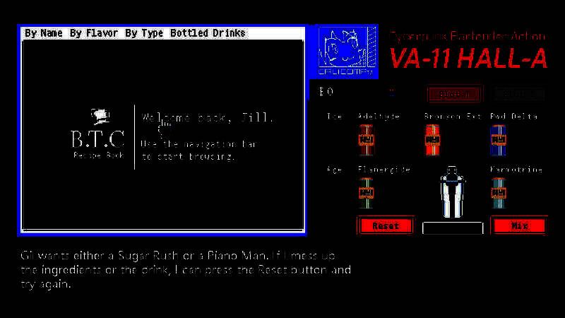 游戏设定在一个名为Glitch City的赛博朋克风格大都市。在这个世界中,企业主宰了一切,压迫民众的纳米机械感染了每个人,还有令人畏惧的白骑士在确保民众对法律的服从。VA-11 HALL-A酒吧就位于这座城市闹市区的一条小路旁,在这个充满压力、贫富差距悬殊、毒品与犯罪横行的城市中,酒吧吸引了各种各样的顾客,而玩家将扮演酒吧中的酒保Jill,通过与顾客的交流和互动,了解这个反乌托邦世界背后的故事。