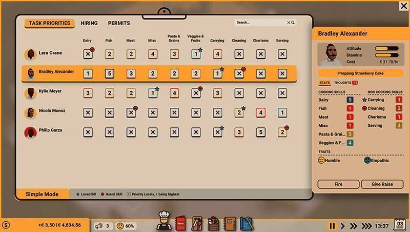 从程序化生成的员工池中进行挑选。你需要考虑每位员工的性格和技能等级的独特组合,以及这些因素员工的工作效率、关系和顾客互动的影响。是不是合适?还是说会被证明是弊大于利?