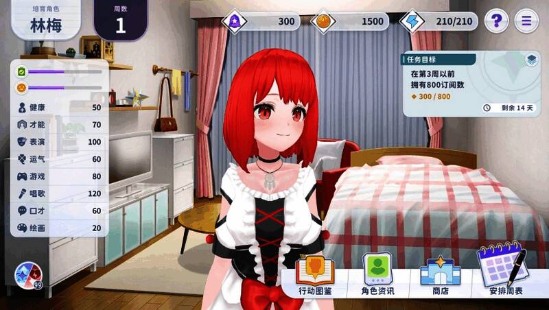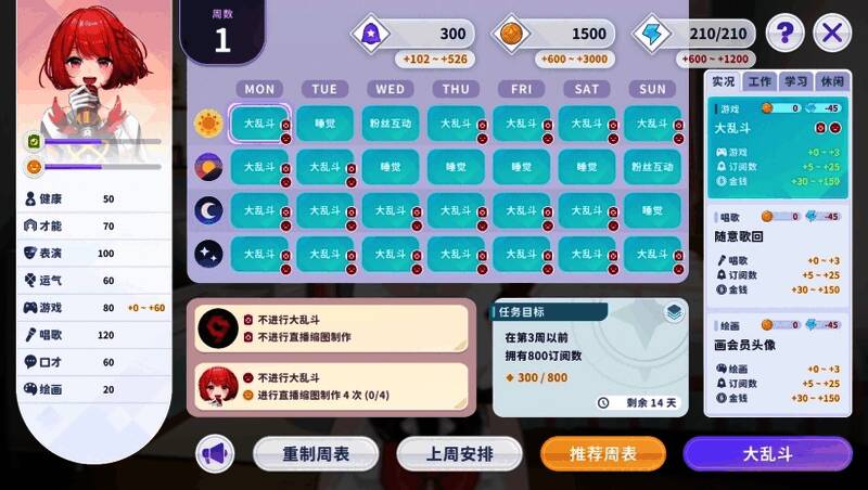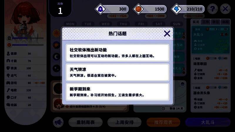 游戏玩法融合了行程管理、事件应对与长期目标达成三大核心系统。玩家需合理规划每日行程,包括安排直播内容(如游戏实况、才艺表演)、技能培训与休息恢复,以平衡角色体力与粉丝期待值。面对突发事件如设备故障或网络争议,需通过对话选项进行危机公关,直接影响主播心态与观众反馈。同时,游戏引入阶段性目标体系,如达成特定订阅数、提升直播评分等,推动主播逐步迈向“Vtuber大师”的终极称号。借助“同学帮助”等社交机制,进一步提升培养效率,增强策略深度。