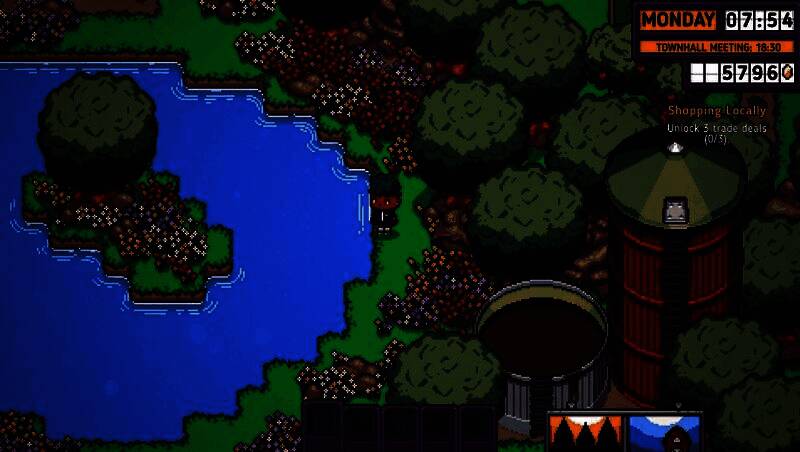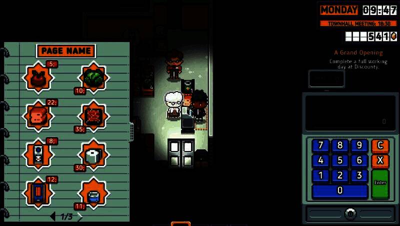 《打骨折超市日记》采用清新复古的像素美术风格,融合北欧童话般的建筑美学与现实主义的生活细节。超市内部货架琳琅满目,商品种类丰富;小镇建筑随季节变换呈现不同风貌,秋季金黄落叶铺满街道,冬季则银装素裹,增强了时间流动的真实感。每个居民都拥有独特的外形与行为动画,如挑剔主妇反复检查保质期、流浪汉在门口徘徊乞食,极大提升了世界代入感。用户界面设计也极具巧思:账本以手写日记形式呈现,任务提示化为贴在屏幕边缘的“便利贴”,完美呼应“经营日记”的主题设定。